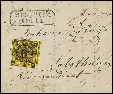 6 Kr. schw./gelborange, aussergewöhnlicher Luxus-Schnittriese mit Teilen von sieben (!) Nebenmarken an allen vier Seiten auf gef. Recobrief (rs. unbed. kl. Papiermängel) mit NS "95" und Ra2 "Müllheim" 1856 nach Solothurn/Schweiz