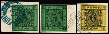 6 Kr. schw./gelborange, überrandig (Nebenmarken) auf Luxusbriefstück, dazu 3 Kr. schw./grün, breitrandig, auf Kabinettbriefstück, sowie auf Briefstück mit blauem NS "92", je sign. Dietrich