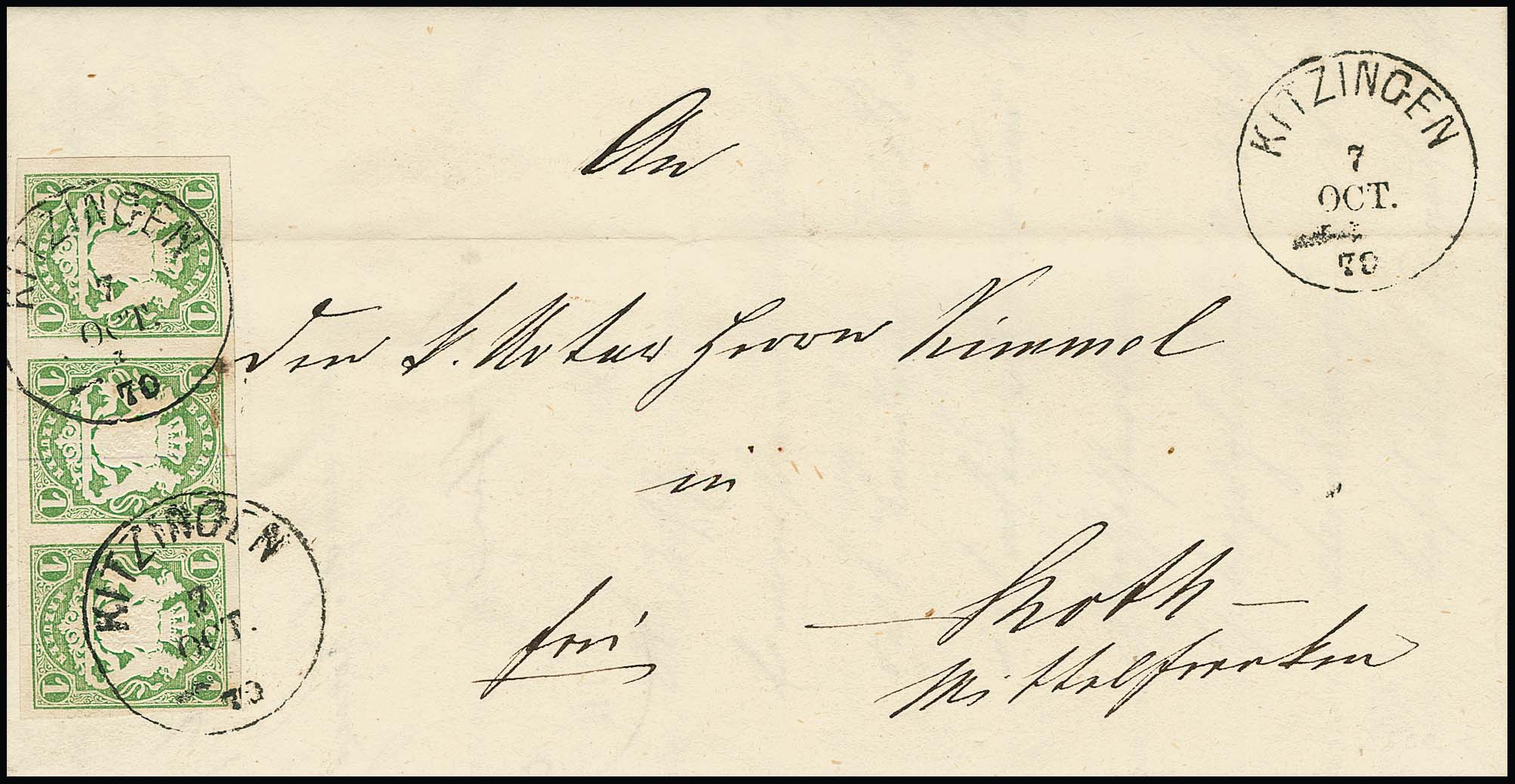 1 Kr. gelblichgrün, breitrandiger Dreierstreifen auf Kabinettbrief aus Kitzingen 1870, eine Vorfaltung nur im Brief, nicht in der Marke