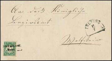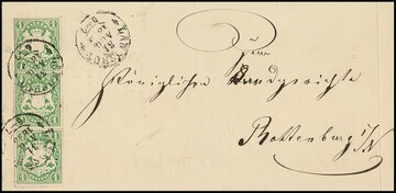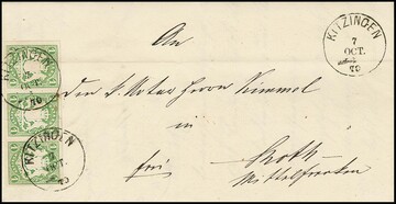 1 Kr. grün per drei, eine Marke links "Lupenrand", mittlere breitandig mit Plattenfehler "Keil an linker 1", auf Brief mit K2 "Landshut", auf Brief seltener PF (Mi. 250,-)