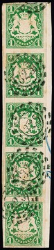 1 Kr. grün, leicht getönter senkrechter Fünferstreifen auf Briefstück mit oMR "325" (München). Allseits breitrandig, untere Marke leichte Bugspur, sonst gut. Senkrechte Fünferstreifen dieser Marke sind selten! Attest Stegmüller