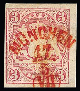 3 Kr. rosa, Luxusstück mit klarem offenem rotem Stempel "München Chargé", sehr dekorativ. Dazu gleicher Stempel auf Postschein