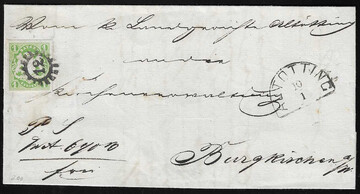 1 Kr. grün, Kabinettstück einzeln auf Brief (rs. gering verkürzt) mit gMR "12" und HK "Altötting" nach Pfarrkirchen, sowie per drei auf Kabinett-Damencouvert von München (Ra2) nach Nürnberg, sign. Pfenninger