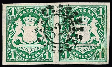 1 Kr. dunkelblaugrün, breitrandiges Kabinettpaar mit zentrischem oMR "325", rechte Marke Plattenfehler "durchbalkte 1", sign. Pfenninger