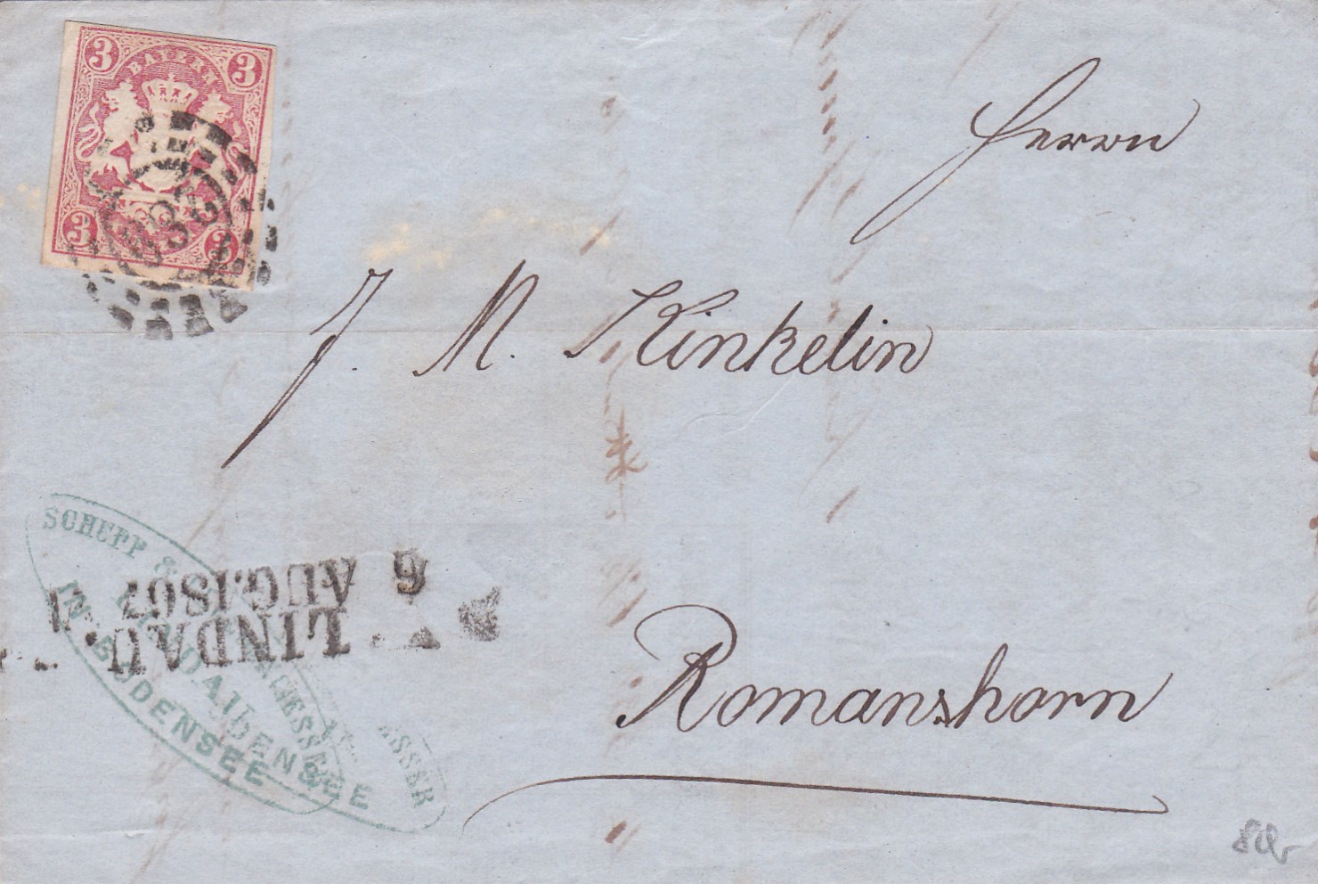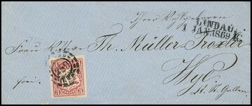 3 Kr. rosa, Prachtstück auf Grenzrayon-Brief von Lindau nach Romanshorn/Schweiz 1867