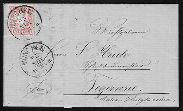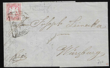 3 Kr. rosa (etwas eingedrungener Gummi), allseits voll- bis breitrandig, auf gef. Pracht-Briefchen mit seltener Fremdentwertung durch taxischen Bahnpost-K1 "Bahnpost Mainz-Worms", sign. Sommer
