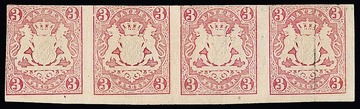 3 Kr. rosa, waagerechter ungebrauchter Viererstreifen mit kleinen Mängeln (ber., zwei Marken etwas hell), dabei zwei Marken mit ungebraucht seltenen Plattenfehlern: 2. Marke PF XXXVIII und 4. Marke XIX. Attest Sem