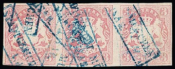 3 Kr. rosa, waagerechter Dreierstreifen (mittlere Marke hell) mit blauem Gerichts-Ra2 von München ("l.d. Isar")