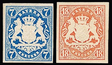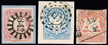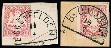 3 Kr. rosa, fünf Briefstücke, ein Brief und eine lose Marke mit den kleinen K2 von fünf der sieben Direktions-Postämtern, Augsburg, Bamberg, Landshut, Regensburg und Würzburg (ex Pfenninger), ferner zwei Briefe mit K1 "München" und K2 "Nürnberg Bhf."