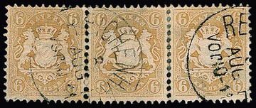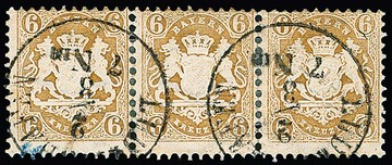 6 Kr. braun, Pracht-Dreierstreifen (in der Zähnung etwas gestützt) mit K1 "Ludwigshafen", sign. Brettl. Mi. 300,-