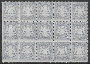 7 Kr. hellblau, bis auf einen Wert mit leichten Anhaftungen postfrischer 15er-Block, ein Fehlzahn, Mi. nur der losen Werte 174,- +