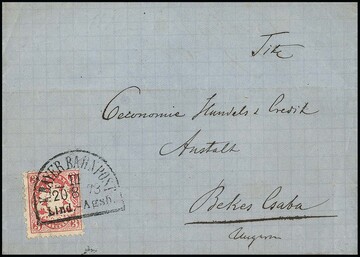 3 Kr. rosa (ein kurzer Zahn) auf prachtvollem Brief mit seltenem Bahnpost-HK "K. BAYER. BAHNPOST Lind.-Agsb." 1873 nach Bekes Csaba in Ungarn, innen Abs.-Prägung aus Lindau