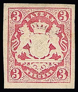 3 Kr. rosa, Abart "ungezähnt" als breitrandiges ungebrauchtes Kabinettstück, Wasserzeichen "weite Rauten", Attest Sem. Eine seltene Marke. Mi. 2000,-