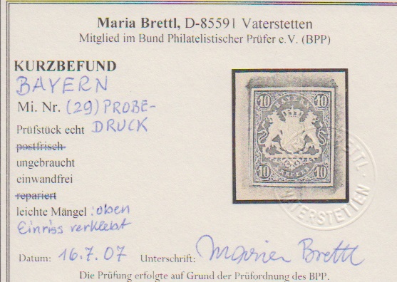 10 Kr. schwarz, Probe-Einzelabzug vom Urstempel, oben im Rand kleiner Einriß verklebt, Fotoexp. Brettl