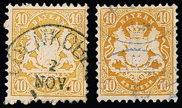 10 Kr. matt- und dunkelgelb, je gutes X-Wasserzeichen, gest. Pracht-/Kabinettstücke, dazu Paar 9 Kr. braunorange, je sign. Brettl. Mi. 1000,-