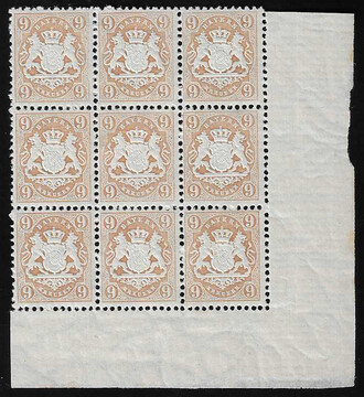 9 Kr. ockerbraun, postfrischer Neunerblock aus der rechten unteren Bogenecke (im Rand Zhg. angetrennt)