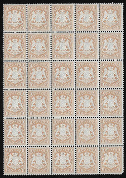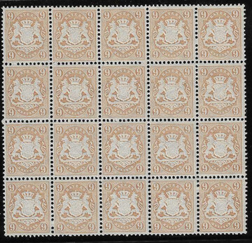 9 Kr. ockerbraun im postfrischen 30er-Block (Schalterbogen, dadurch linke obere Marke kleiner aufnadelungsbedingter Eckfehler, ein kurzer Eckzahn), seltene Einheit!