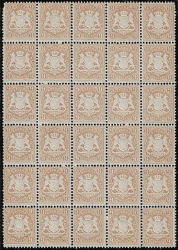 9 Kr. ockerbraun im postfrischen 30er-Block (mittig angetrennt, re. untere Marke aufnadelungsbedingt kl. Eckfehler)