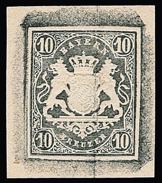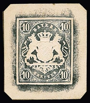 10 Kr. schwarz, Probe-Einzelabzug vom Urstempel (auf Unterlage aufgezogen)