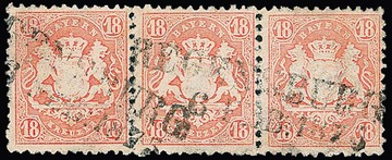 18 Kr. mattziegelrot, ausgabetypisch teils rauh gezähnter Pracht-Dreierstreifen mit L2 von Regensburg, Mi. 250,-