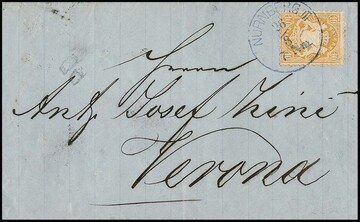9 Kr. mattgelb, gutes Wz. "enge Rauten" als seltene Einzelfrankatur auf Faltbrief (rs. fehlt ein Klappenteil und kleine Nadelstiche, davon zwei auch rechts oben unauffällig in der Marke) nach Verona. Einzelfrankaturen dieser Marke sind selten! Sign. Brettl und Fotoexp. Sem. Mi. 1900,-