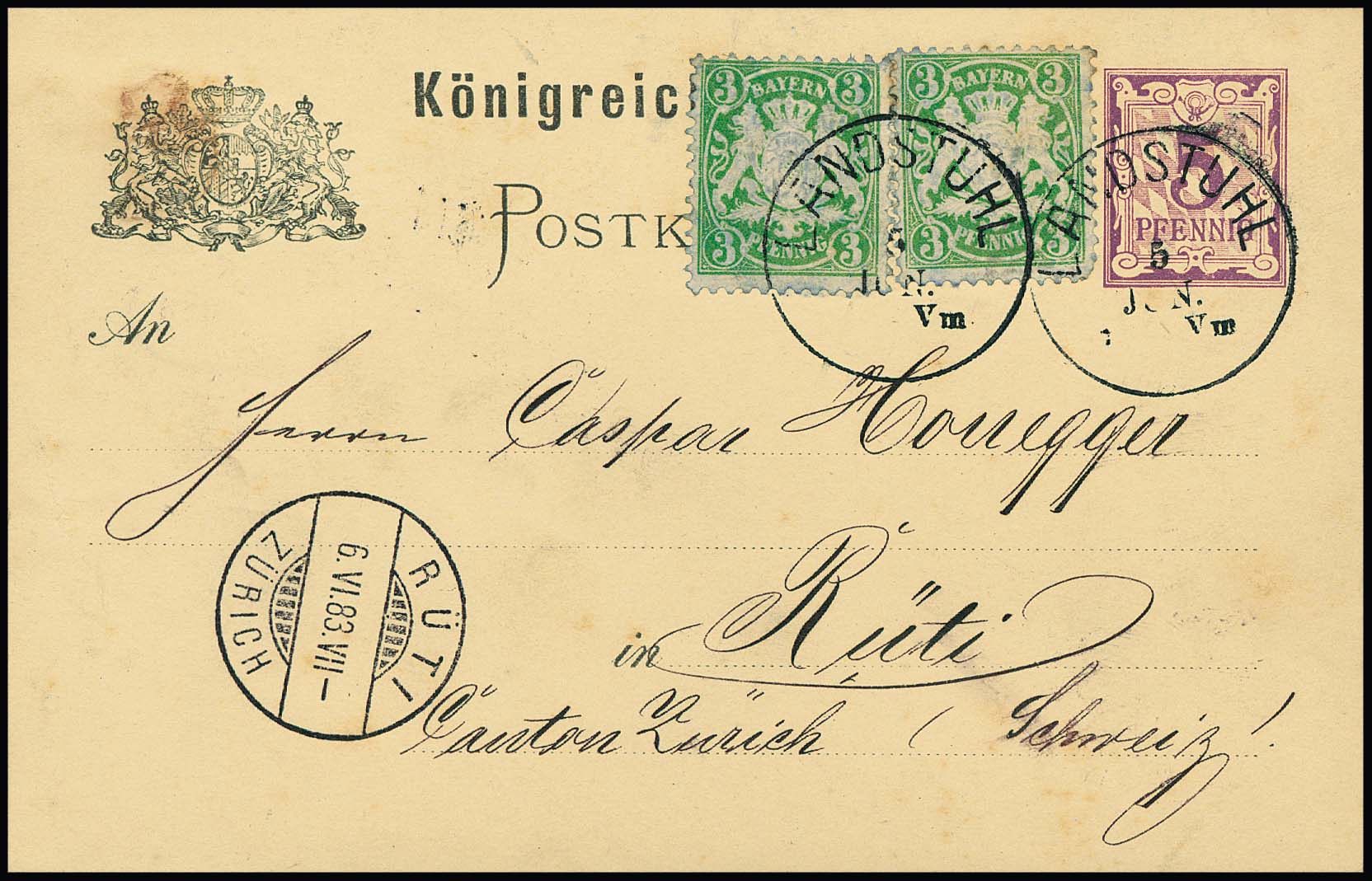 3 Pfg. grün, zwei bereits einmal verwendete Postbetrugsmarken mit versuchter ausgewaschener Entwertung (einmal ein kurzer Zahn), auf Ganzsachenkarte 5 Pfg. von Landstuhl in die Schweiz