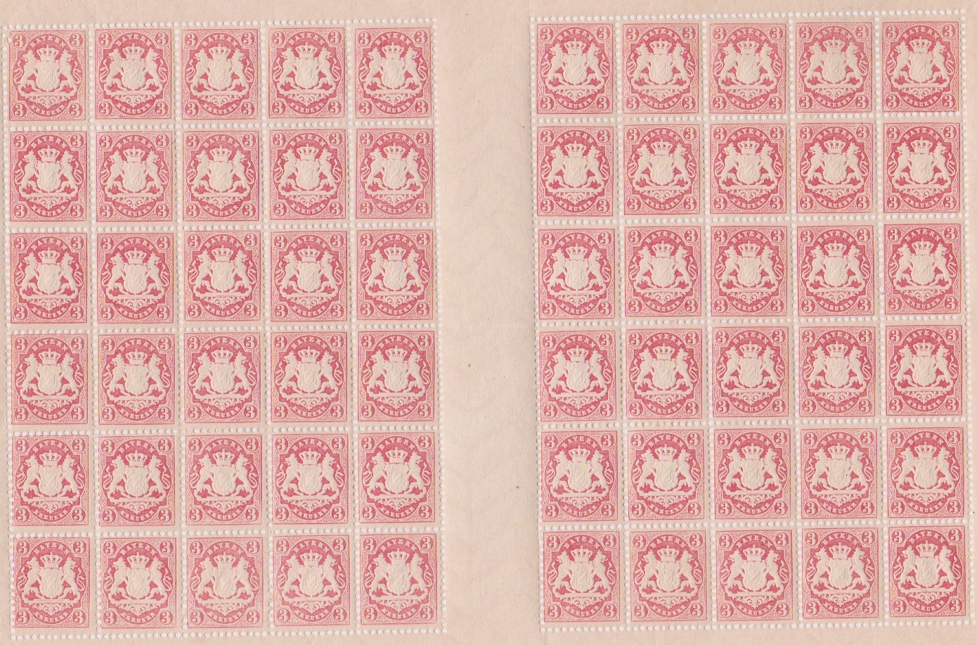 1 Kr. grün, 3 Kr. rosa, je kpl. postfrische Doppelbögen zu 60 Exemplaren mit den sechs Zwischenstegpaaren und Plattenfehlern, z.B. Nr. 32I, 33II, III, sowie weiteren Plattenfehlern (Felder 2, 14, 42, 47). Bei der 1 Kr. ein Wert natürlicher Papierausfall