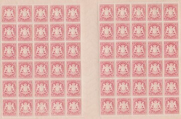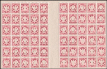 3 Kr. rosa, kpl. postfrischer Bogen zu 60 Exemplaren mit den sechs Zwischenstegpaaren, u.a. auf den Feldern 19 und 40 die Plattenfehler II und III