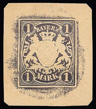 1 Mk. braunlila, Probe-Einzelabzug vom Urstempel in der Variante "spiegelverkehrtes N von BAYERN", kleine punkthelle Stelle, jedoch bisher einzig bekannter Einzelabzug dieser Marke auf Papier mit Wasserzeichen ("3M"), sign. Bühler und Fotoexp. Schmitt