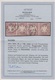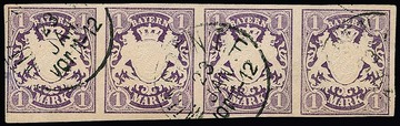 1 Mk. violett, waagerechter, voll-, meist breitrandiger Viererstreifen mit K1 "München I.F.". Die erste Marke etwas bügig, die rechte mit kleiner Randaufspaltung und Plattenfehler "Kratzer von Krone zum rechten Rand", als Einheit mit Plattenfehler selten! Attest Sem
