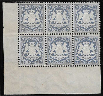 7 Kr. blau, postfrischer Sechserblock aus der linken unteren Bogenecke