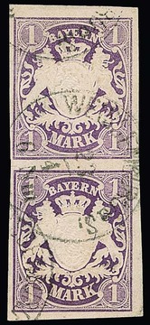 1 Mk. purpur, senkrechtes Kabinettpaar mit K1 von Weissenburg, Mi. 300,-