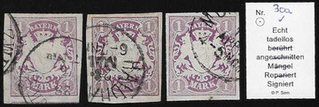 1 Mk. violett, rotviolett und dunkelviolett, drei tadellose Exemplare als interessante "Farbscala", sign. Sem bzw. Pfenninger. Mi. 490,-