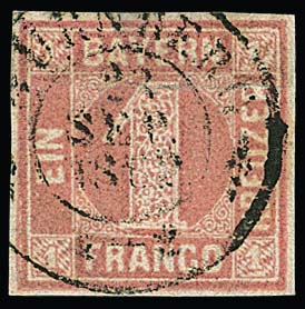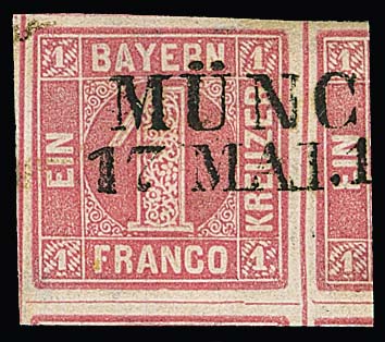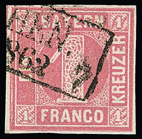 1 Kr. rosa, gute Platte II mit allseits spitzen Ecken, Ra2 von München, allseits gut gerandet, nur unten links kleiner Spalt geschlossen, sonst optisch schöne Marke, Attest Brettl. Mi. 2000,-