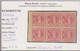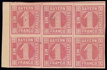 1 Kr. rosa, Platte II, im Sechserblock vom linken Bogenrand, die beiden rechten Marken der unteren Reihe tadellos postfrisch, der obere Dreierstreifen ungebraucht mit hellen Stellen, dabei die rechte Marke mit verschiedenen Plattenfehlern. Mi. nur für das postfrische Paar 500,-, Fotoexp. Brettl