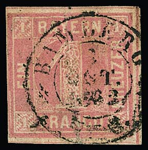 1 Kr. rosa, gute Platte II, Bugspur und leichte Patina, aber optisch gut, noch voll- bis breitrandig und zentr. K2 von Bamberg, Attest Stegmüller. Mi. 2000,-