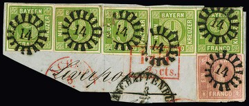 1 Kr. rosa und fünfmal 9 Kr. gelbgrün einzeln, in Typen II(2) und III(3), auf Briefstück von Überseebrief mit gMR "14" und HK "Aschaffenburg" (via Aachen und Liverpool), zwei 9 Kr. leicht eckberührt, sonst gut. Fotoexp. Sem "attraktives Briefstück"