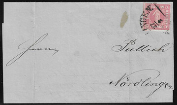 1 Kr. rosa, Prachtstück mit Plattenfehler III auf zweifach gefalteter Drucksache mit HK "Lauingen", interessant "forwarded" aus Reutlingen zwecks Portoersparnis, sign. Sem. Mi. 200,- +