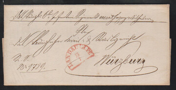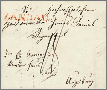"Landau", 1828, roter L1 auf Brief eines Angehörigen des Inf.-Rgt. "Herzog Wilhelm" in der Bundesfestung an ein "Armen- u. Kinderhaus" in Augsburg, als Privatbrief portopflichtig
