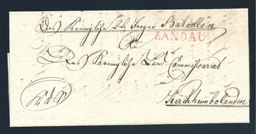 "Landau", 1829, roter L1 auf Brief aus der Bundesfestung, hs. "das königliche 2te. Jaeger Bataillon", nach Kirchheimbolanden
