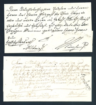 "Landshut in Bajern", (1790), Schreibschrift-L1, sowie zweiter Brief mit großem L1 "Amberg", je auf Briefen an den Hofkriegsrat des Pfalzgrafen in München