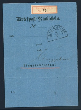 "Ingenheim", HK 1882 auf blauem Briefpost-Rückschein nach Bergzabern mit frühem R-Zettel "Eingeschrieben"