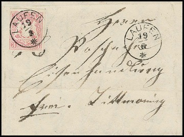 "Laufen", der Zier-K1 mit achtstrahligem Stern klar auf Prachtbrief 3 Kr. rosa (links vollrandig), sowie auf loser 3 Kr.