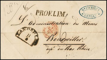 "Landau", 1854, HK nebst schwarzem L1 "PROV. LIM.", sowie roter HK "Neustadt a.d.H." nebst L1 "PROV. LIM." in rot 1847, auf zwei Briefen nach Frankreich