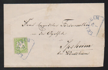 "Leipheim", blauer K1 auf Pracht-Drucksache (Verlobungsanzeige) mit 1 Kr. grün