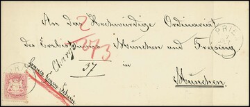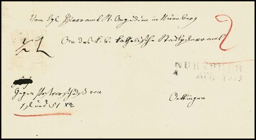"Nürnberg", L2 1852 auf Postvorschußbrief nach Oettingen, erst mit einer 3 Kr. blau (Farbfragmente noch erkennbar) frankiert, dann vom Postbeamten doch als unfrankiert zu behandelnde Fahrpostsendung erkannt und Marke entfernt