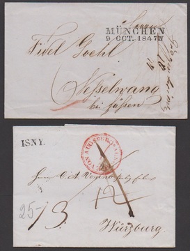 "Nellenbruck", 1839/1847, L1 und Segmentstempel rs. als Transitstpl. auf zwei Briefen aus Isny nach Würzburg, sowie aus München nach Nesselwang