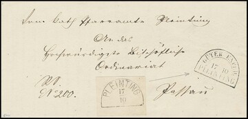 "Pleinting", 1867, seltener Güter-Expeditions-HK als Aufgabestempel auf Brief, der falsch verwandte Stempel mit Papier-Ausschnitt und richtigem HK vom gleichem Tag überklebt (dieser Überkleber zur Präsentation wieder versetzt), ungewöhnliches Provisorium
