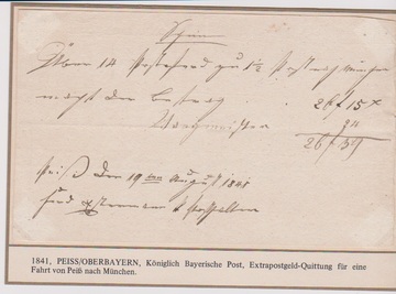 "Peiss", 1841, Extrapostquittung für eine Fahrt mit der Postkutsche nach München