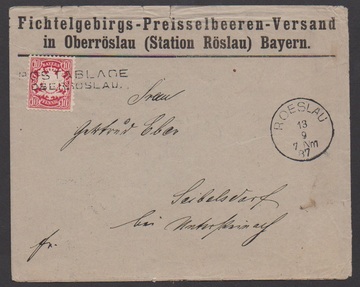 "Oberröslau", klarer Postablage-L2 als Markenentwertung, K1 "Roeslau" nebengesetzt, auf Vordruckbrief (oben kl. Randmgl.) 1887 mit 10 Pfg.